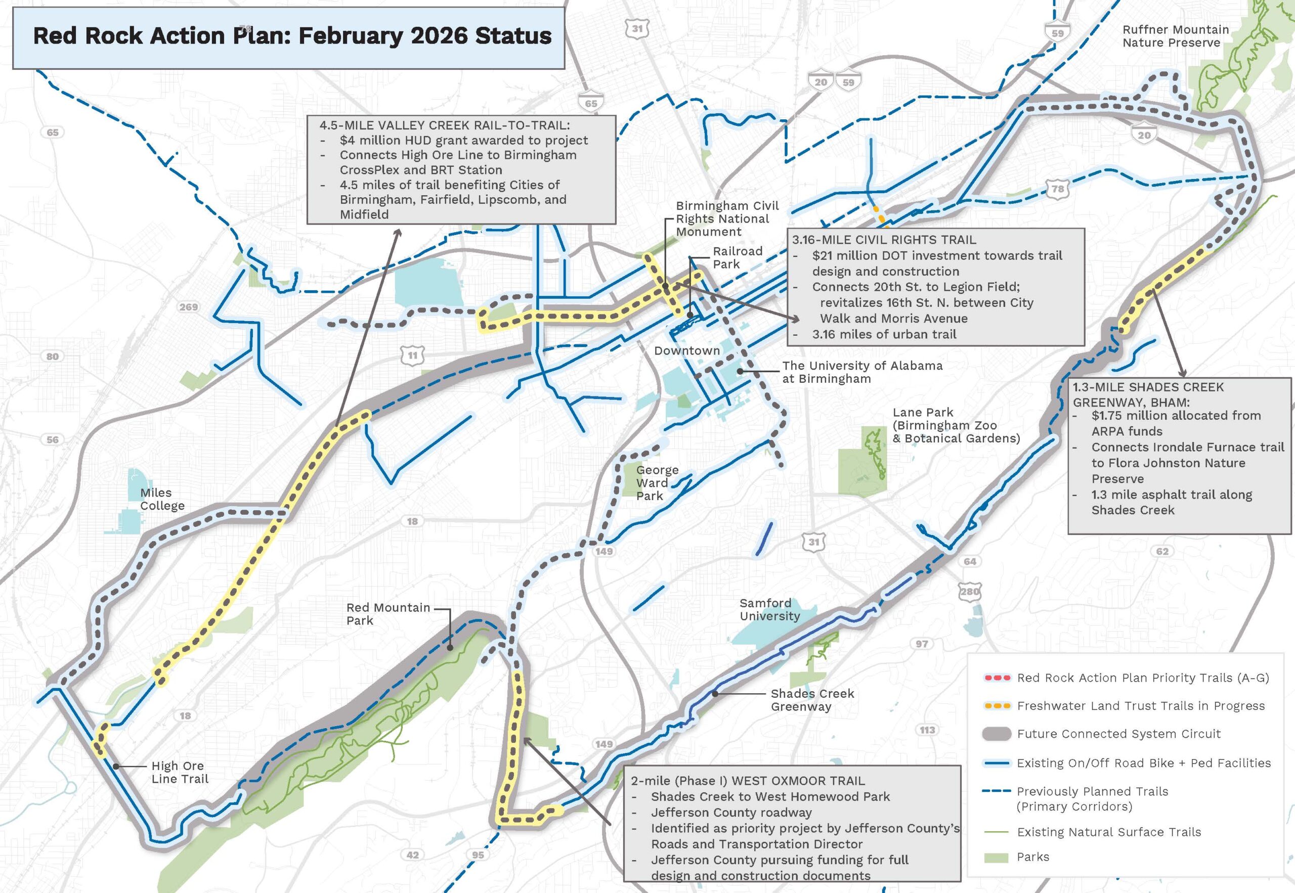The Red Rock Action Plan, released in 2023, is a 15-year strategic plan to develop 19-miles of new trails, ultimately creating a 36-mile loop around the Greater Birmingham Metropolitan Area. The plan identifies seven priority projects, that when combined with existing Red Rock Trails, will connect the Cities of Birmingham, Fairfield, Homewood, Irondale, Midfield, and Mountain Brook.